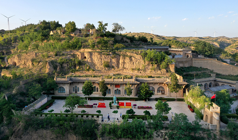 游人在陕西省榆林市米脂县杨家沟革命旧址参观(9月10日摄,无人机照片)。新华社记者 陶明 摄