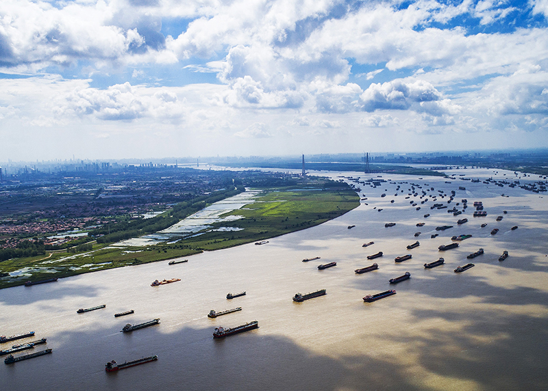 船舶在湖北省武汉市阳逻港区水域行驶(2018年8月13日摄,无人机照片)。新华社记者 肖艺九 摄