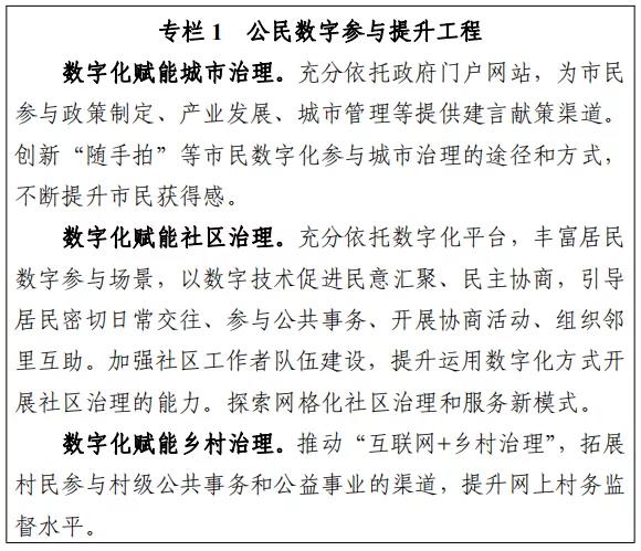 ? 4.促进数字公共服务普适普惠。建设完善全国一体化政务服务平台,加快线上线下融合互补,优化政务服务体验,畅通丰富办事渠道,让企业和个人好办事、快办事。在政务服务大厅、医院、交通枢纽等服务场所设立志愿者、引导员或服务员,依托城乡社区综合服务设施开展宣传培训,为群众提供指导和协助,助力提升数字公共服务使用技能。