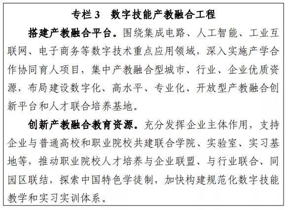 ? 15.完善数字技能职业教育培训体系。完善数字技能职业教育,加强职业院校数字技能类人才培养,动态更新职业教育专业目录,推进专业升级和数字化改造,优化完善课程设置,建设高水平数字技能职业教育教师队伍。制定完善数字技能职业教育国家标准,推行“学历证书+职业技能等级证书”制度,打造一批高水平数字技能职业院校和专业。加大数字技能职业培训力度,研制培训方案和内容标准,规范数字技能职业培训,试点探索“互联网+”职业技能培训模式,推动数字化培训模式发展。