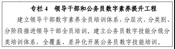 ? 13.提升领导干部和公务员数字治理能力。加大领导干部和公务员信息化培训力度,丰富数字经济、数字社会、数字政府等领域线上培训资源,把提高党员领导干部数字治理能力作为各级党校(行政学院)的重要教学培训内容。引导领导干部和公务员运用网络了解民意、开展工作,提升学网、懂网、用网的能力。在公务员选拔任用中,加强数字能力方面的考察。