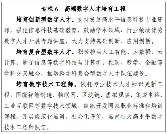 ? 11.提升新兴职业群体数字技能。面向“互联网+教育”、互联网医疗、电子商务、供应链管理服务、线上办公、“虚拟”产业园、“无人经济”等新业态新模式,制定数字领域新职业的职业标准,丰富职业培训课程,开展从业人员培训,壮大新兴职业群体人才队伍。引导支持新兴职业群体,积极利用5G、人工智能、虚拟现实、大数据、区块链等数字技术创新创业。