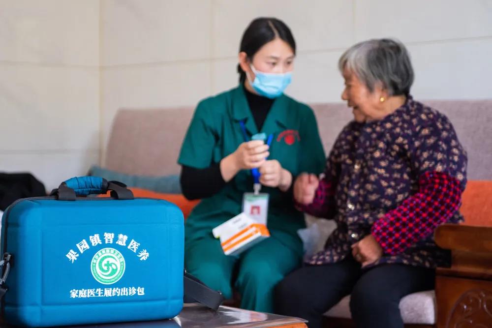 2021年11月12日,在湖南省长沙市长沙县果园镇杨泗庙社区,医务人员刘敏指导居家老人用药。(新华社记者陈思汗 摄)
