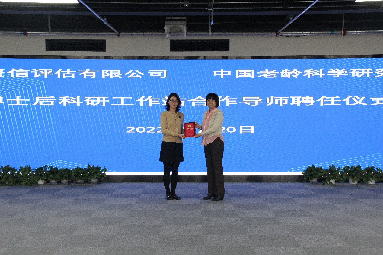 ? ?聘任仪式上,远东资信研究院彭澎院长为中国老龄科学研究中心老龄经济与产业研究所研究员王莉莉颁发了合作导师聘任证书。