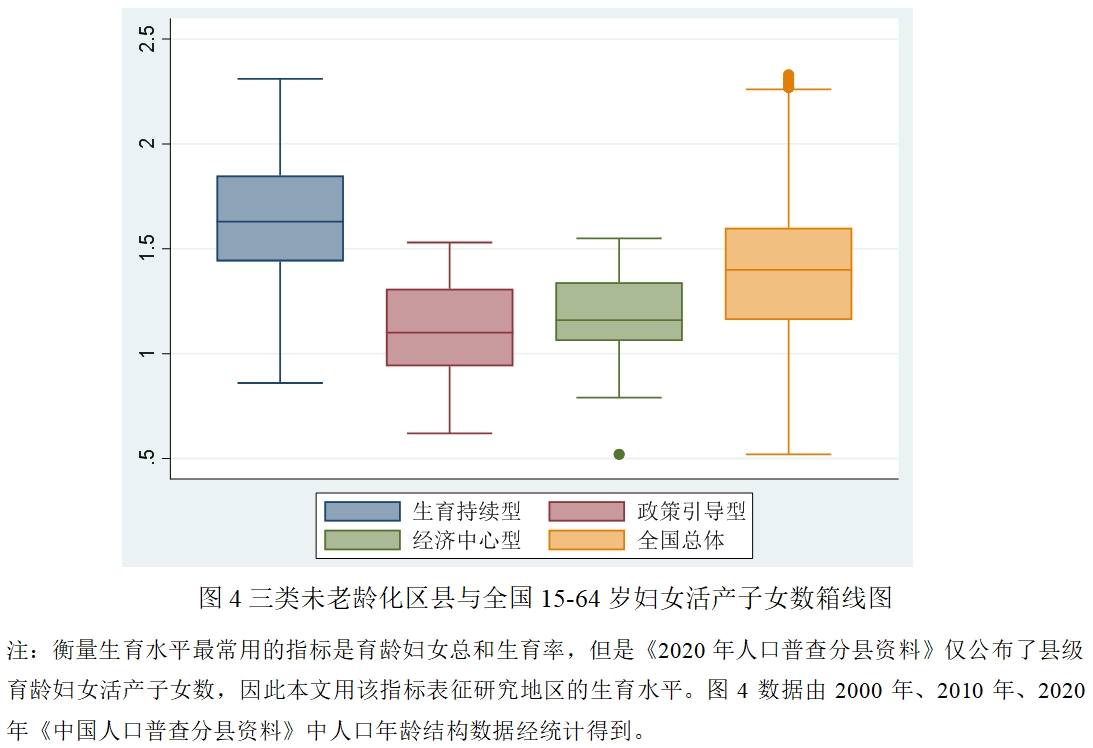 相反,经济社会因素对生育水平的抑制作用不利于经济中心型区县人口结构保持年轻化。经济中心型区县的15-64岁妇女平均活产子女数为1.25,低于全国平均水平。首先,这些地区长期执行独生子女生育政策,并且在独生子女政策放开后,生育水平也没有回升。其次,经济中心型区县的生活成本高,子女教育、住房、医疗、养老等都是较大的支出项目,在相对较高的经济压力下,年轻人口的生育意愿低。同时,这些地区产业发展基础好,女性劳动参与率高,不愿因为生育而降低在劳动力市场中的参与度,也造成了低生育意愿。并且,受到后现代主义价值观影响,年轻人口更愿意将有限的资源投入到自身的幸福生活中,而非对下一代的培养上。多种原因共同导致经济中心型区县的生育水平低。