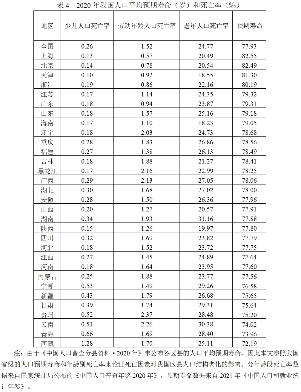 死亡因素主要影响老年人口。死亡是个人面临的必然事件,个人在各年龄段均存在一定的死亡概率,因此年龄别的死亡概率差异是影响人口年龄构成的直接因素之一。受生理因素和外在因素的影响,老年人口的死亡概率相对较高。我国31个省区市少儿人口死亡率多在0.5‰以内(表4),劳动年龄人口死亡率多在2.5‰以内,而老年人口死亡率则多在20‰以上。死亡的主体是老年人,因此人口预期寿命就成为反映死亡的重要因素。我国人口平均预期寿命不断延长,但是各省区市之间存在一定差距,人均预期寿命短的地区老年人口比例自然会相对比较低。2020年上海和北京的人均预期寿命超过82岁,较长的人口预期寿命必然对这些地区的老龄化程度具有抬升作用,而西藏、青海等地人均预期寿命尚不足75岁,相对较短的人口预期寿命对其老龄化程度具有抑制作用。