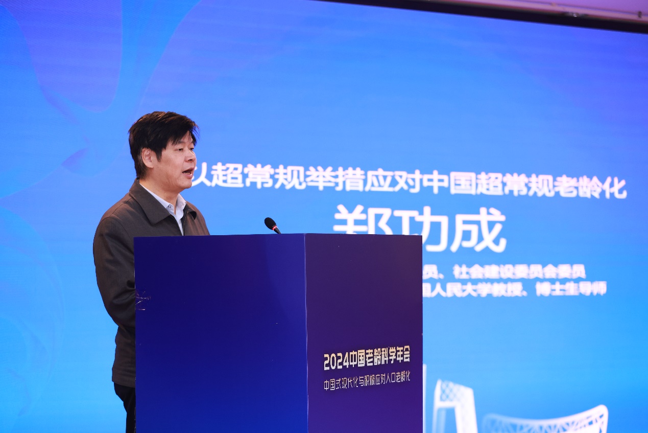 十四届全国人大常委会委员、中国社会保障学会会长、中国人民大学教授郑功成的发言主题是《以超常规举措应对中国超常规老龄化》。郑功成教授在发言中指出,中国的老龄化是超常规的老龄化,要客观的正视超常规的老龄化,树立超常规老龄化的思维,用系统性的超常规举措来加以应对。一是应对老龄化进程中必须坚持社会经济相协调的宏观政策取向。二是充分发挥中国制度优势。三是尽快总结公建民营养老服务业的发展经验,形成协同治理中国模式。四是积极维系中华传统,大力发展城乡社区互助养老服务。