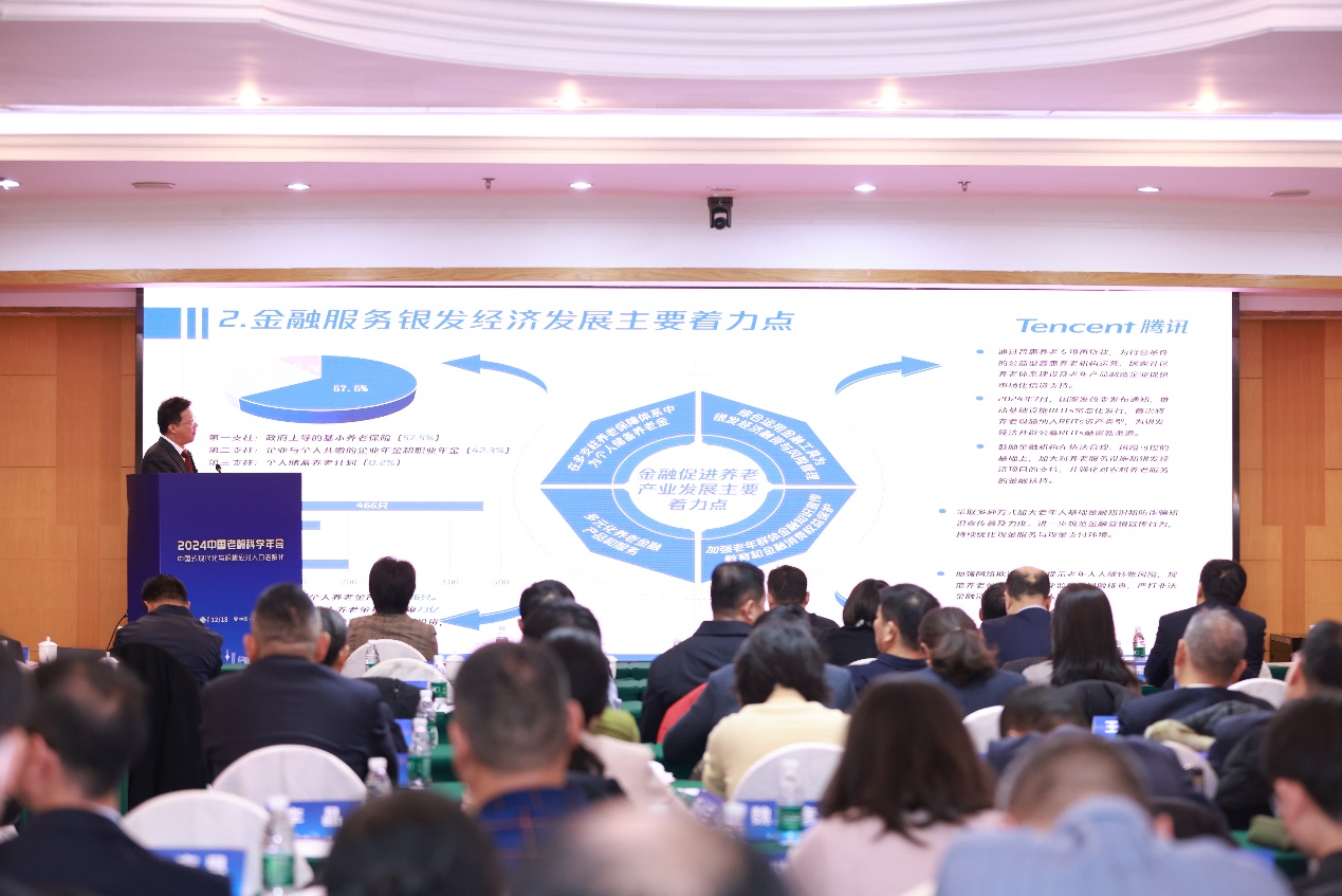 腾讯公司副总裁韩开创发言的主题是《金融科技双翼共振,助力银发经济腾飞》。他在发言中指出,金融和科技之间不仅是支撑养老银发经济相应的产业链,自己产生了共振,在科技赋能之下,金融会变成智慧金融,在金融的助推之下,科技会加速迭代升级,这两个翅膀会越来越粗壮有力,这两个行业能够响应国家的政策引导,能够积极渗透到银发经济的各个产业、各个场景和各个机构,对养老产业产生助推作用。